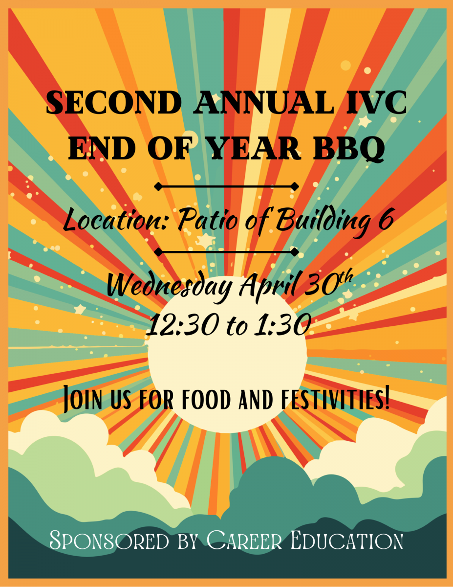 Date April 30th, 2025 - 12:30pm Location Patio Outside of Bldg. 6, IVC Presenter Career Education Contact Ron Palmer [email protected] 707 240-7019; Lesley Good [email protected] 415 307-1184 Fee Free