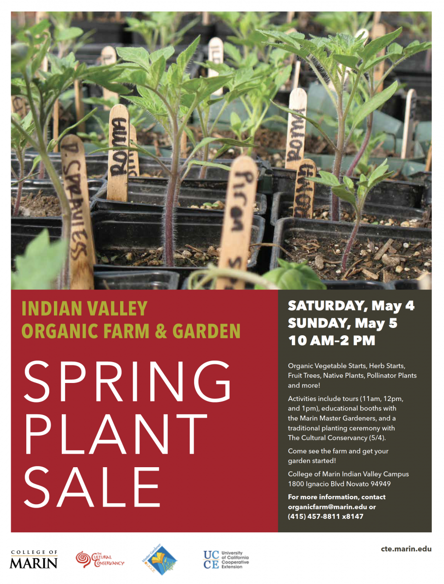 Activities include tours (11 am, noon, and 1 pm), educational booths with the Marin Master Gardeners, and a traditional planting ceremony with The Cultural Conservancy (5/4).