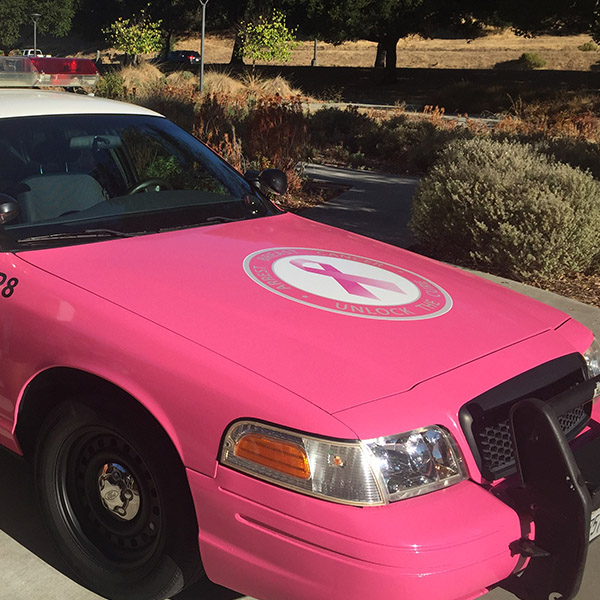 KENTFIELD, CA—October 4, 2016—October is National Breast Cancer Awareness Month, and this past weekend the College of Marin Police Department participated with a bold show of support. On Saturday, October 1, one of the police patrol cars—donned in pink—was parked at the Indian Valley Campus as over a thousand runners passed by. Freshly wrapped with the message of breast cancer awareness, the patrol car was finished just in time to kick off the awareness campaign during Rotary Club of Ignacio’s Marin Color 5K.